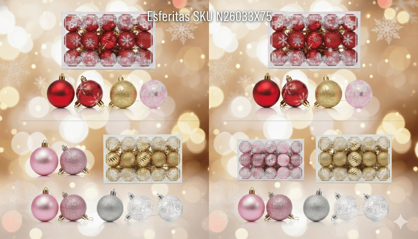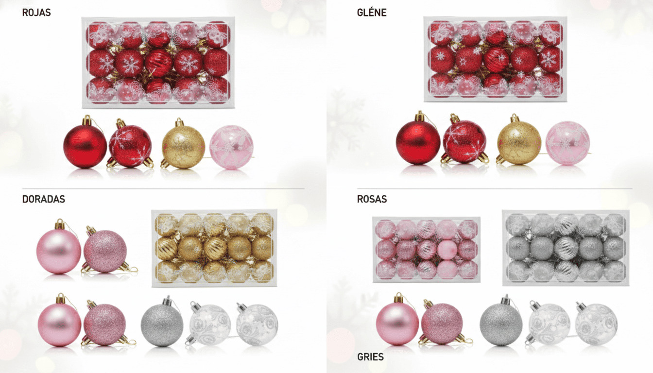 CAJA DE ESFERITAS DE COLORES PLATEADO, DORADO, ROJO, 15PZ.