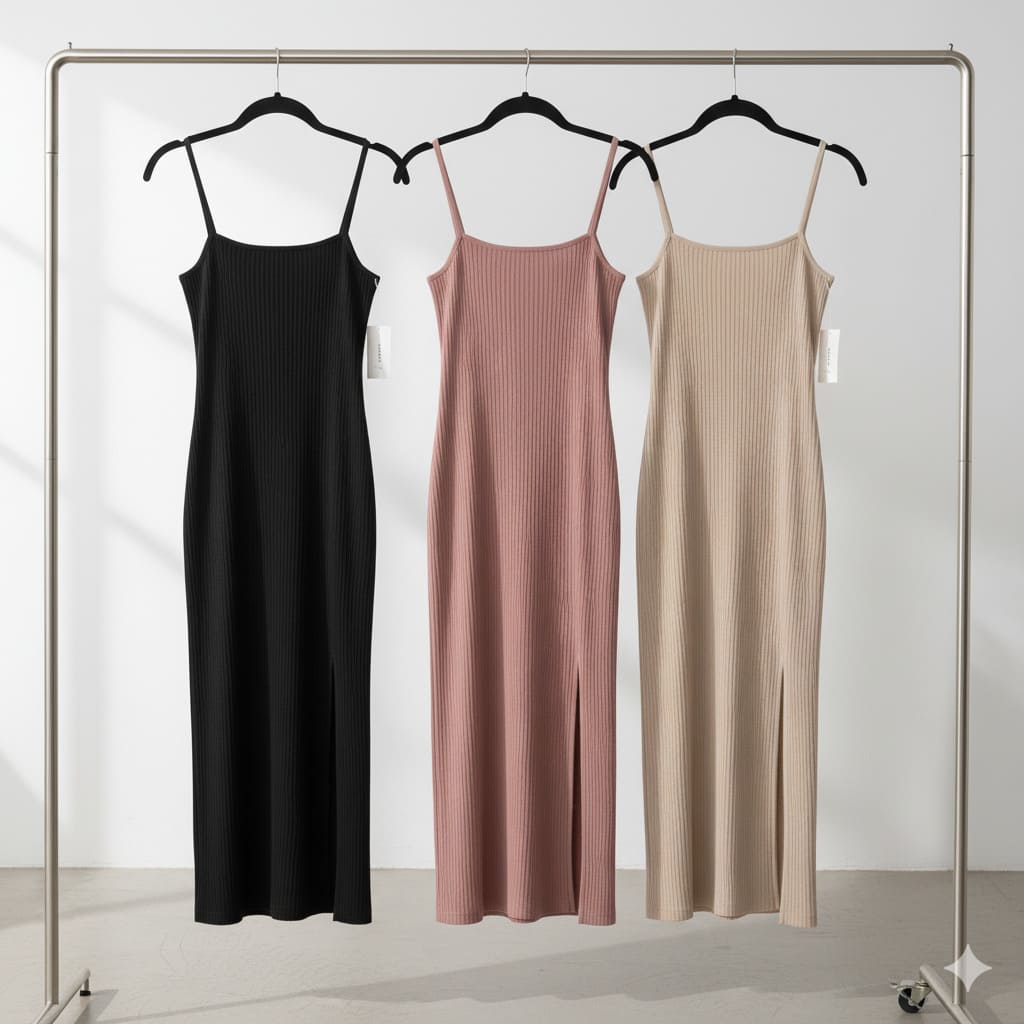 VESTIDO LARGO DE TIRANTES ENTRE ABIERTO DE LA PIERNA CON UN DISEÑO DE RAYAS, DE COLOR ROSA CAFE, Y GRIS , AZUL REY.